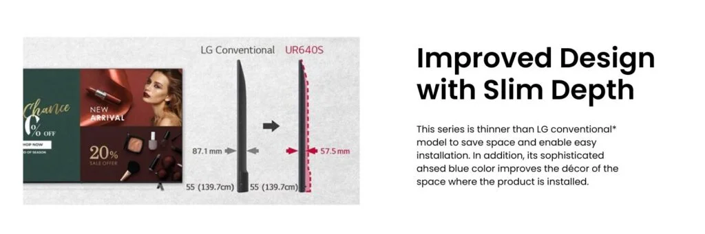 LG SuperSign CMS is integrated management program supporting creation and management of digital media and content deployment, optimized for LG signage. LG Commercial TV-lg-55UR640S With its simple and intuitive menus and layout options, it enhances efficiency for content creation and editing, scheduling and distribution, improving user experience. In LG Commercial TV-lg-55UR640S, it supports multiple displays and accounts, is able to be linked to external databases, and allows server access from mobile devices.